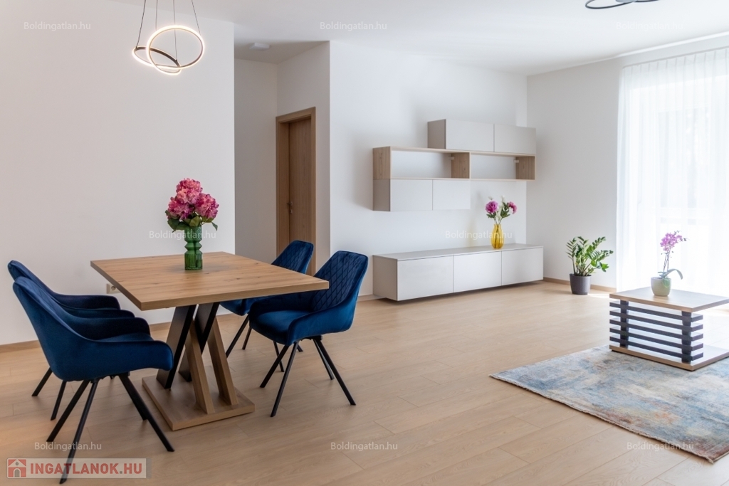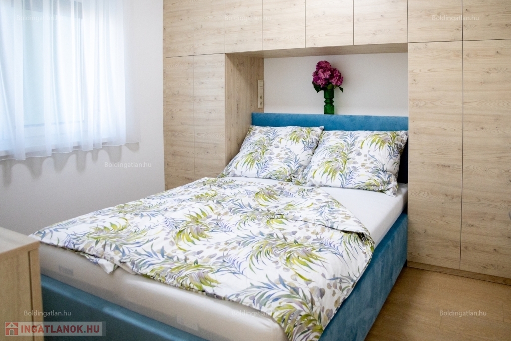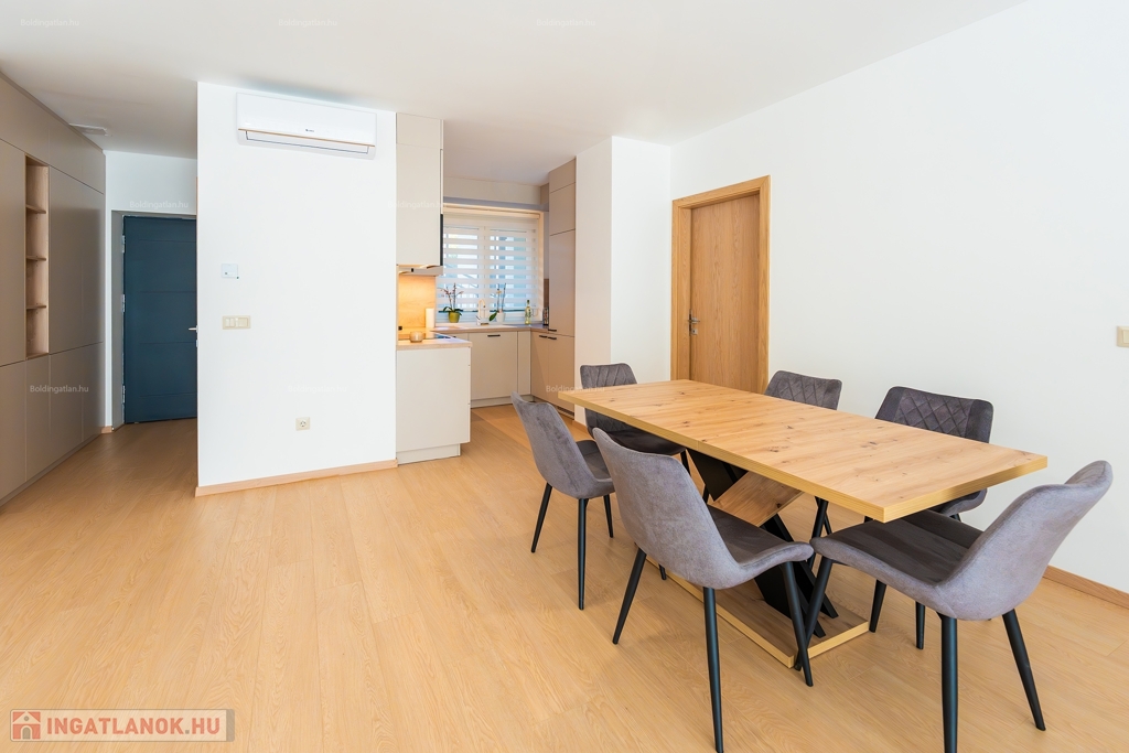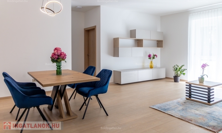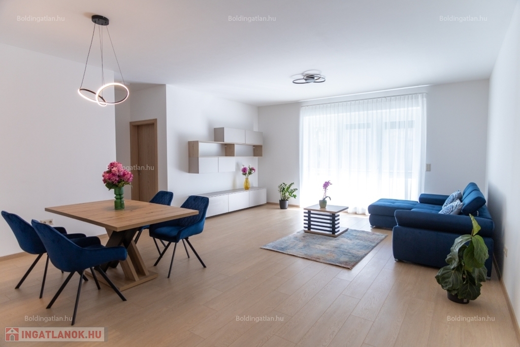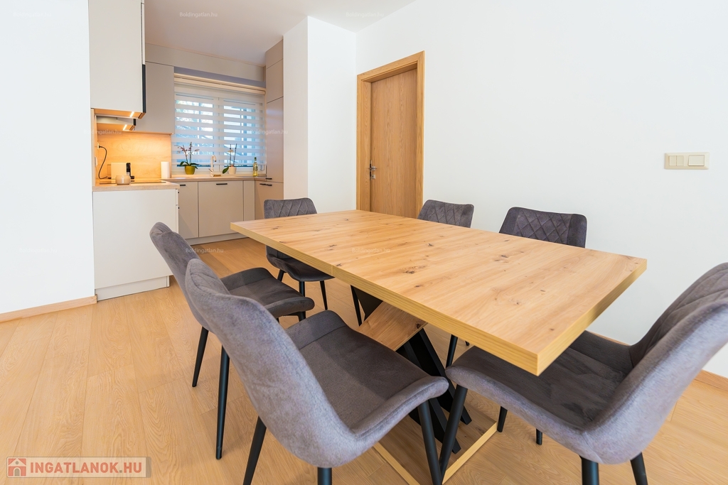 Kaposváron a belvárosban, a Dési Huber utcában - a kórház közelében - igényes kivitelben épült, modern architektúrájú 30 lakásos, új társasház 1. emeletén, 79 m2-es bútorozott és gépesített lakás + 14 m2-es terasszal együtt kiadó. A lakásban nappali-étkező-konyha, 2 szoba, közlekedő, szélfogó, fürdőszoba-wc, wc helyiségek kerültek kialakításra. Az épület korszerű energetikájú, a lakás fűtés levegő-víz hőszivattyús Nibe fűtésrendszerrel - padlófűtéssel, a fürdőszobában elektromos törölközőszárító radiátorral biztosított, továbbá a lakás hűtése Gree típusú Fan-coil rendszerrel történik, a fürdőszobában magas minőségű Wellis szerelvények kerültek beszerelésre. A lakás fűtéséhez, vagy hűtéséhez szükséges villamosenergiát az épület tetején elhelyezett napelemek biztosítják, a társasházban központi vízlágyító berendezés is beszerelésre került. A lakáshoz tartozik 1 személygépkocsi beálló az épület zárt udvarában. A kórház az épület közvetlen közelében van, továbbá általános iskola 200 m, gimnázium 500 m, további közintézmények is néhány perc alatt kényelmesen elérhetőek gyalog. Bérleti díj: 300.000.- Ft/hó + rezsi + 2 havi kaució