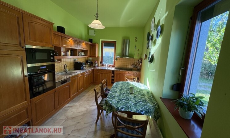 Balatonszárszón 96 m2-es nagyon jó műszaki állapotú családi ház, 44 m2-es melléképülettel, gondozott telekkel eladó. A lakóházban előszoba-nappali, 2 szoba, közlekedő, konyha-étkező beépített konyhabútorral és gépekkel (AEG micro és mosogatógép, elektromos főzőlap és elszívó, Electrolux sütő, és hűtőszekrény), fürdőszoba, wc pissoirral, kamra helyiségek kerültek kialakításra, valamint a közlekedőből nyílik a lejárat a 10 m2-es pincébe is. A lakóház fűtése NOBO elektromos fűtőpanelekkel és a nappaliban kandallóval megoldott, a melegvíz ellátást villanybojler biztosítja. Az épület energetikai korszerűsítésen esett át, amely során a tulajdonos a homlokzatra 15 cm-es BAUMIT hőszigetelést, a padlás födémre 20 cm kőzetgyapot szigetelést rakatott, új borovi fenyő nyílászárókat építtetett be - az ablakokra fémredőnyt rakatott fel, valamint vízszűrőt és riasztót is felszereltetett. A rendezett udvaron 44 m2-es belülről részben már felújított, kívülről szintén hőszigetelt melléképület-kisház áll új Terran Zenit , amelyben egy 1 szoba-konyhás udvari lakrész kialakítható, valamint 1 személyautó részére garázs és tároló is található. Az ingatlan a kitűnő lokációja és a kialakítása miatt akár nyaraltatásra is alkalmas lehet, az autópálya 5 percre van, élelmiszerboltok a közelben megtalálhatók, a strand is csupán 800 m-re van. Telek: 1.429 m2 (155)