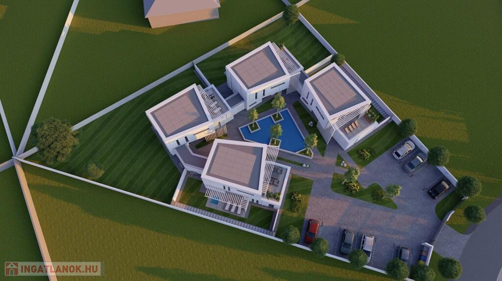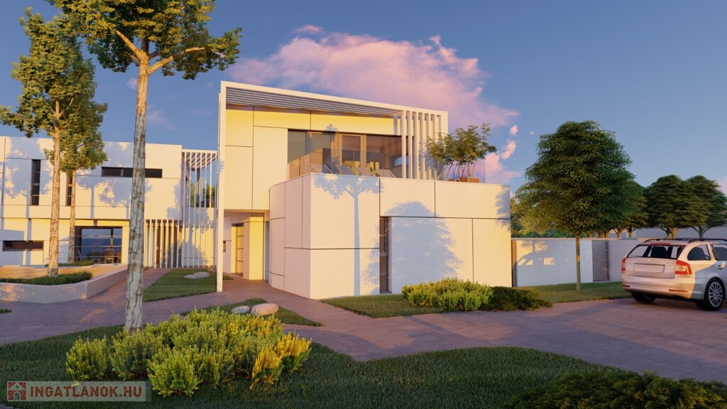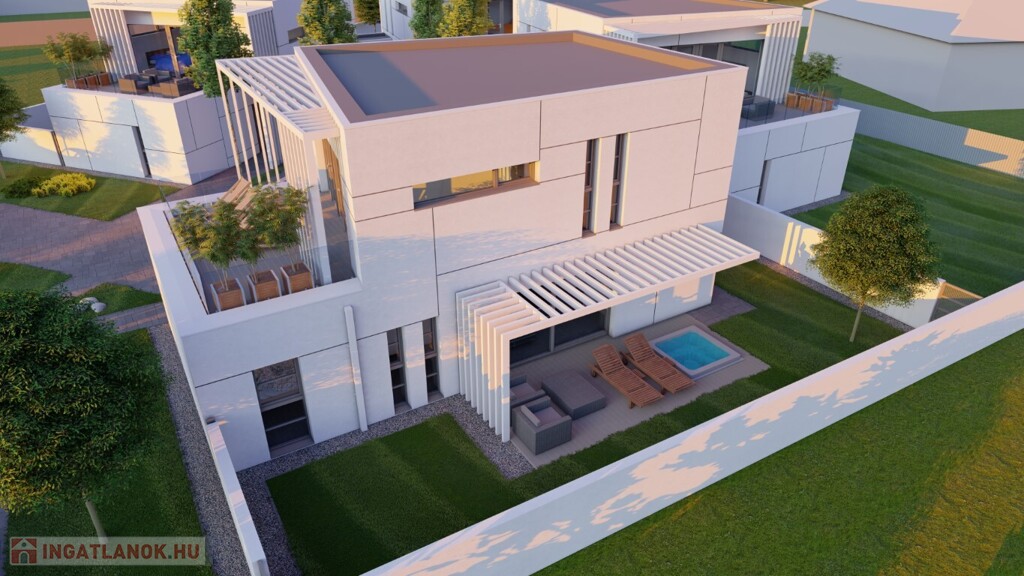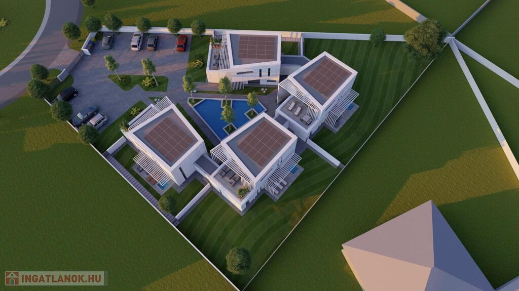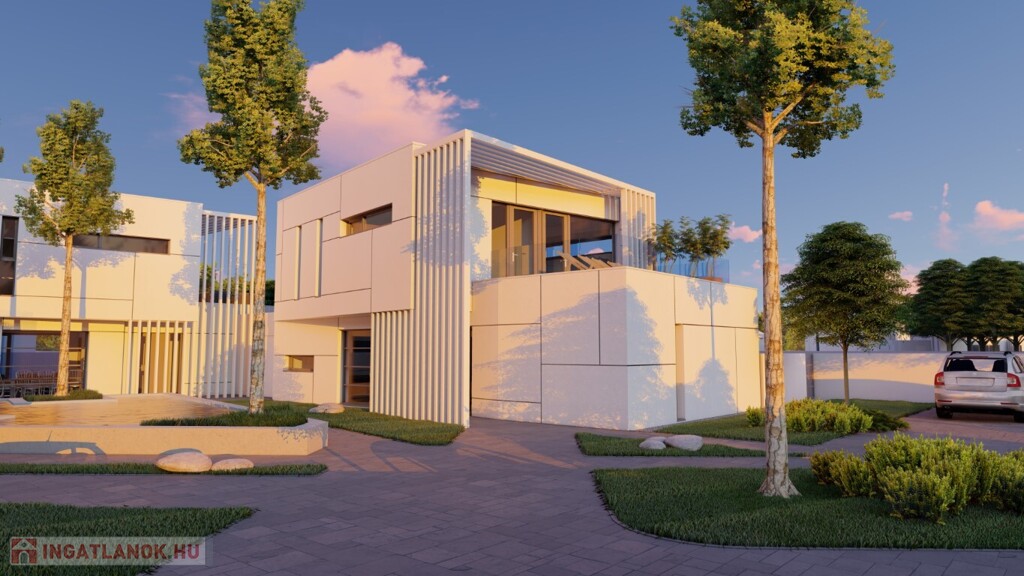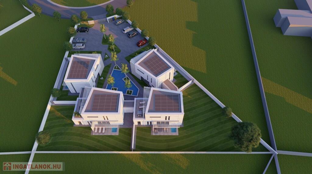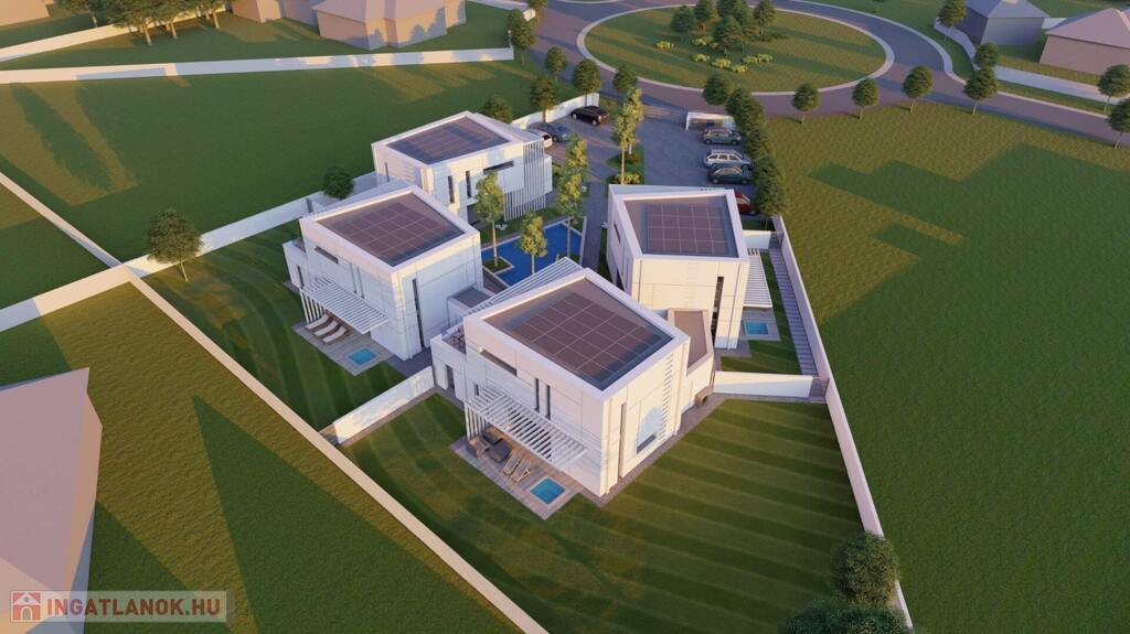 Kaposváron a Kisgát városrészben, a Reményik Sándor utcában, modern környezetben lévő, új építésű, exkluzív - magas minőségben kivitelezett, korszerű építőanyagokból épülő 4 lakásos Villaparkban - 125 m2-es kétszintes családi ház eladó. A lakóház földszintjén (76,8 m2) előszoba, nagy üvegportállal rendelkező tágas nappali - étkező, konyha, 1 szoba, gardrób, fürdőszoba-wc, további wc, gépészeti - tároló helyiségek kerültek kialakításra, továbbá tartozik hozzá egy 20,70 m2-es fedett, belső udvar felé néző terasz is - süllyesztett jakuzzival. Az épület felső szintjén (48,20 m2) előszoba, 2 szoba, fürdőszoba-wc és háztartási helyiségek, illetve 20,77 m2-es nyitott terasz vannak. A korszerű, modern energetikájú - alacsony rezsivel rendelkező - épület villany ellátása H tarifával megoldott, a fűtése LG típusú hőszivattyúval kerül kivitelezésre, továbbá fan-coil rendszer biztosítja a helyiségek fűtését és hűtését. Távirányítással működő zsaluziák lesznek felszerelve, illetve prémium minőségű szaniterek és szerelvények, illetve csapok - Wellis, illetve HansGrohe - kerülnek beépítésre. Az igényesen kialakított udvaron tartozik a lakáshoz 1 db fedett gépkocsibeálló és további 1 db kocsibeálló. Az épület teljes kivitelezését - és várható 2026. III. negyedévben történő átadását - követően a - komoly referenciákkal rendelkező - beruházó végzi majd a Villapark közös költséggel járó üzemeltetését is. A lakáshoz tartozó önálló udvar mérete: 75,55 m2